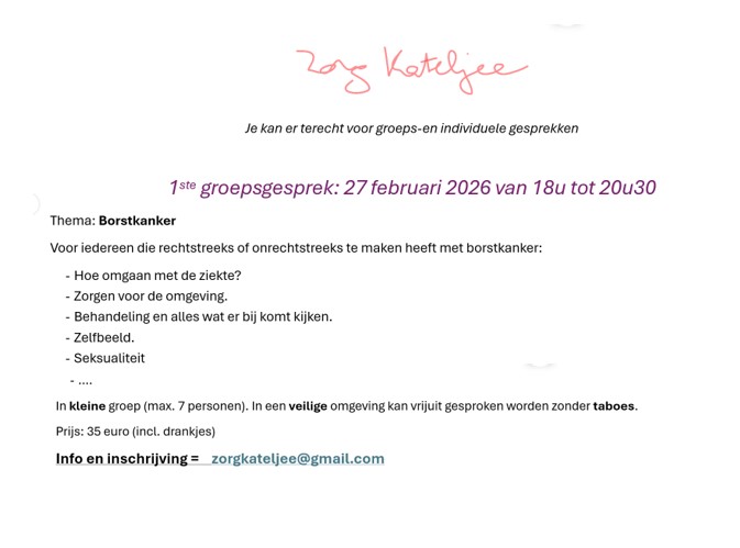 Volgend groepsgesprek rond borstkanker heeft plaats op 27 februari 2026 van 18u tot 20u30,